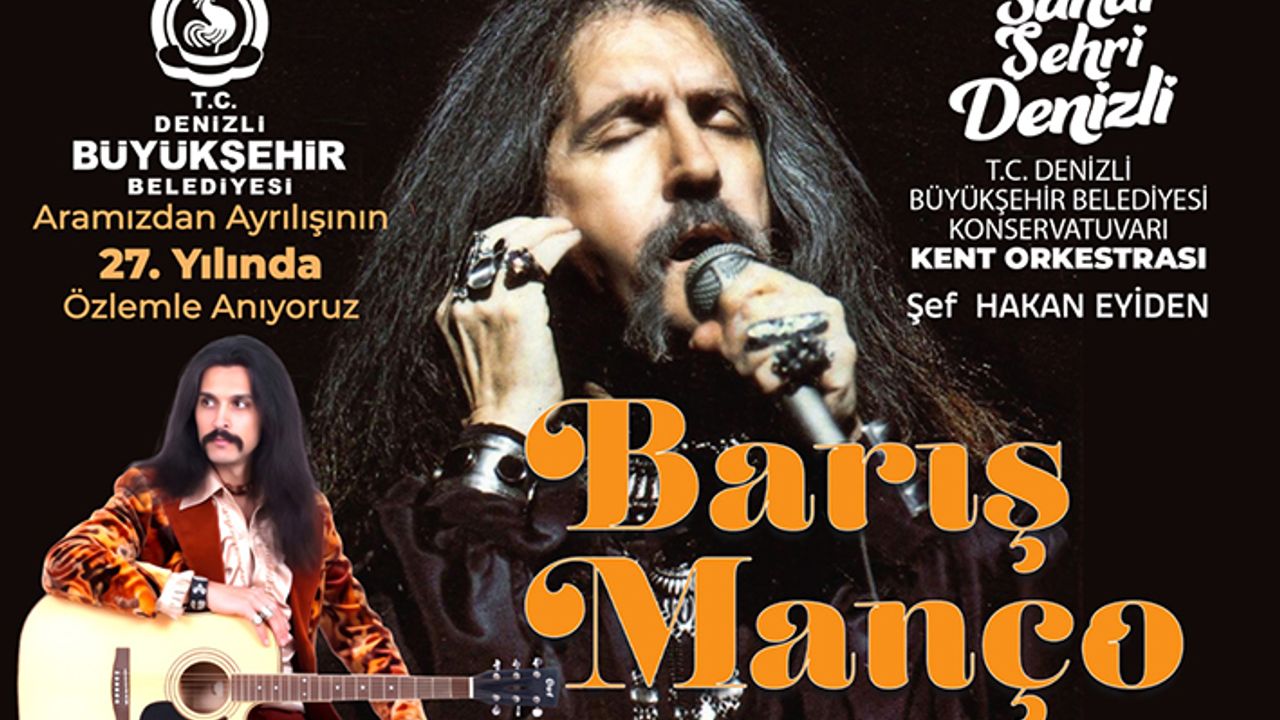 Sözleriyle kuşakları birleştiren, müziğiyle ortak hafızada silinmez izler bırakan Barış Manço’nun unutulmaz eserleri, Denizli Büyükşehir Belediyesi Konservatuvarı Kent Orkestrası eşliğinde, solist Murat Bolat’ın yorumuyla yeniden hayat bulacak. 31 Ocak 2026 Cumartesi günü saat 20.00’de, Denizli Büyükşehir Belediyesi Kongre ve Kültür Merkezi Özay Gönlüm Salonu’nda gerçekleştirilecek anma konseri, Barış Manço’nun yıllar geçse de ilk günkü gibi dinlenen şarkılarını müzikseverlerle buluşturacak. Ücretsiz olarak gerçekleştirilecek konsere katılmak isteyen vatandaşlar, e-biletlerini e-bilet.denizli.bel.tr adresi üzerinden temin edebilecek.