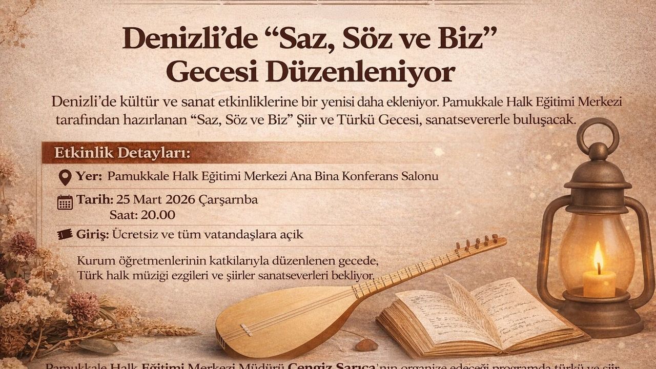 Kurum öğretmenlerinin katkılarıyla düzenlenen etkinlikte, Türk halk müziğinin sevilen eserleri ile şiir dinletileri aynı sahnede yer alacak. Katılımcılara hem duygusal hem de nostaljik anlar yaşatması beklenen gece, Denizlililere keyifli bir sanat atmosferi sunacak. Etkinlik, Pamukkale Halk Eğitimi Merkezi Müdürü Cengiz Sarıca öncülüğünde organize edilirken, tüm vatandaşlara açık ve ücretsiz olacak.