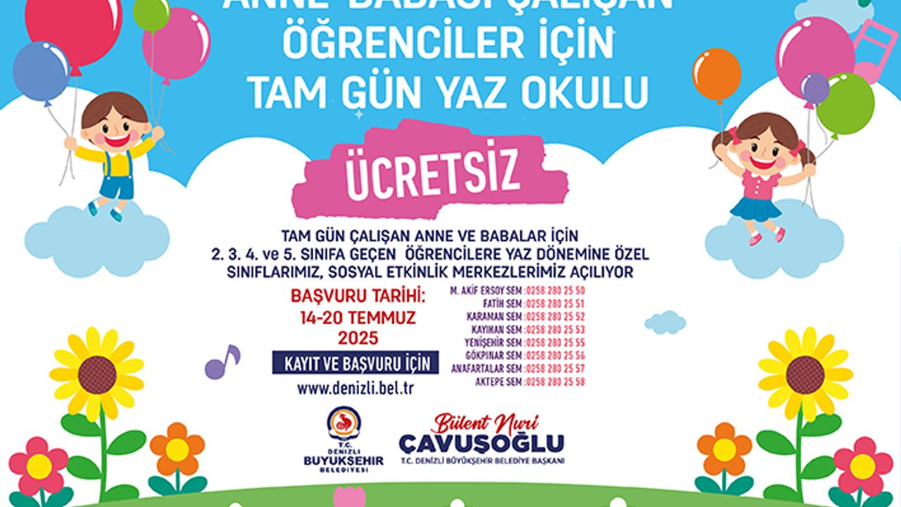 Denizli Büyükşehir Belediyesi, anne ve babası tam gün çalışan ailelerin çocukları için büyük bir sosyal destek projesine daha imza atıyor. 2., 3., 4. ve 5. sınıfa geçen öğrencilere yönelik hazırlanan “Ücretsiz Tam Gün Yaz Okulu” programı ile yaz tatili boyunca öğrenciler hem öğrenecek hem de eğlenceli vakit geçirecek.